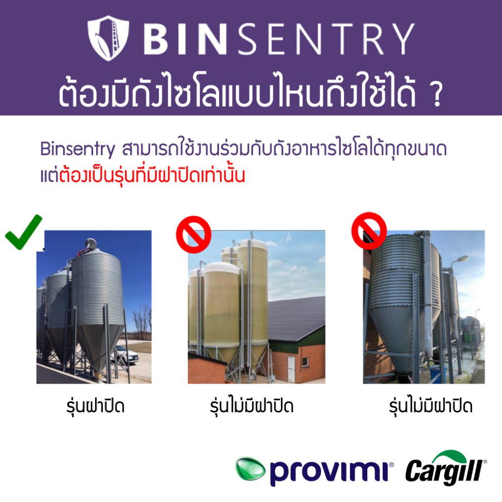 เครื่อง Binsentry สามารถใช้งานร่วมกับถังอาหารไซโลได้ทุกขนาด แต่ว่าต้องเป็นถังอาหารเฉพาะรุ่นที่มีฝาปิด เท่านั้น